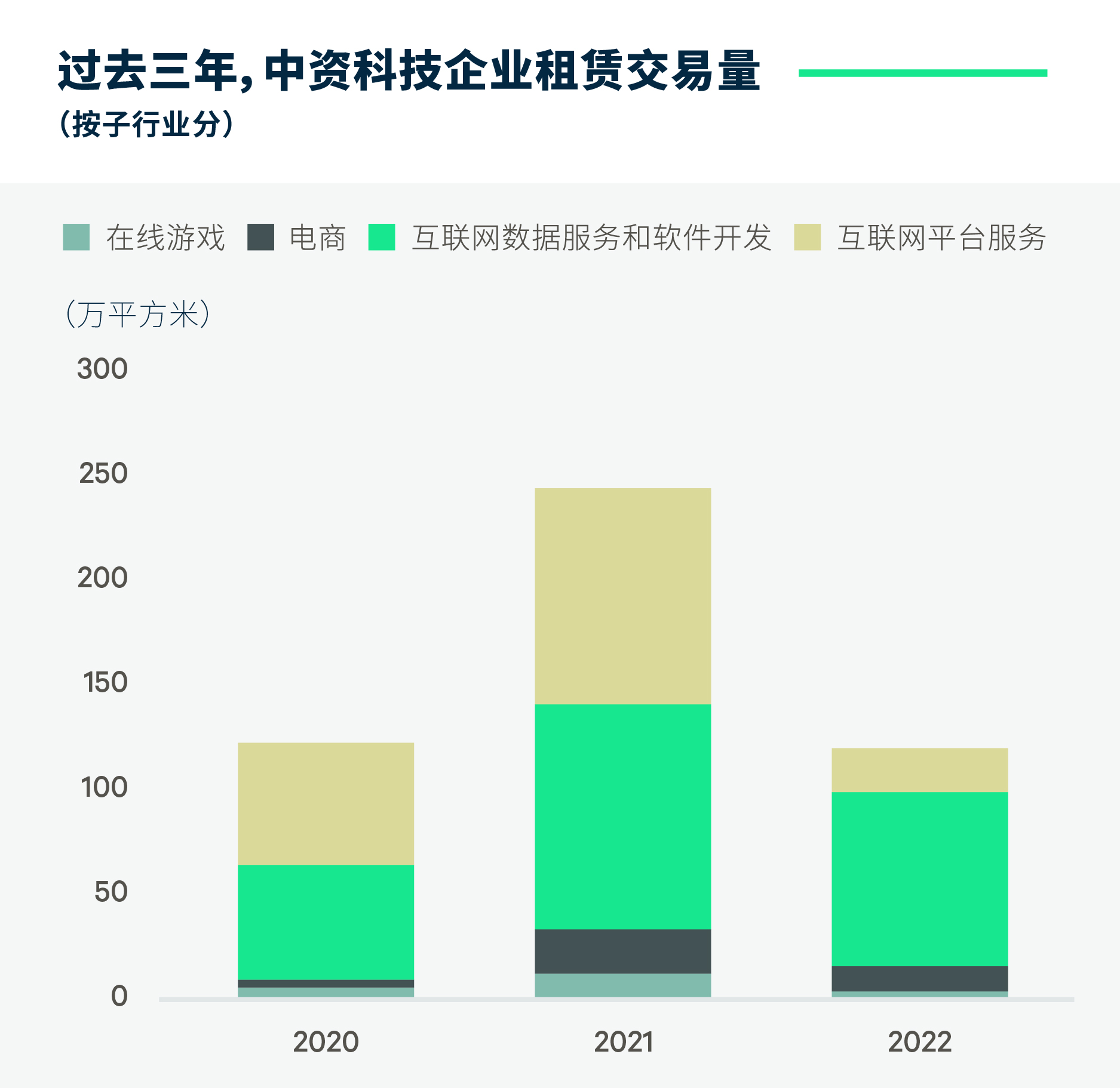 资本市场改革的持续深化是推动证券基金机构业务扩张的动因。2022年,证券/基金/期货/信托行业在中资金融企业租赁交易量中的占比达到50%,较2020年上升14个百分点。与此同时,国内科技互联网行业持续向“数实融合”领域和核心科技研发转型升级也已初见成效,行业新增长引擎逐渐加速。数据显示,以人工智能、云计算为代表的互联网数据服务以及软件开发企业租赁交易量在科技行业中的占比从45%大幅增加至69%。