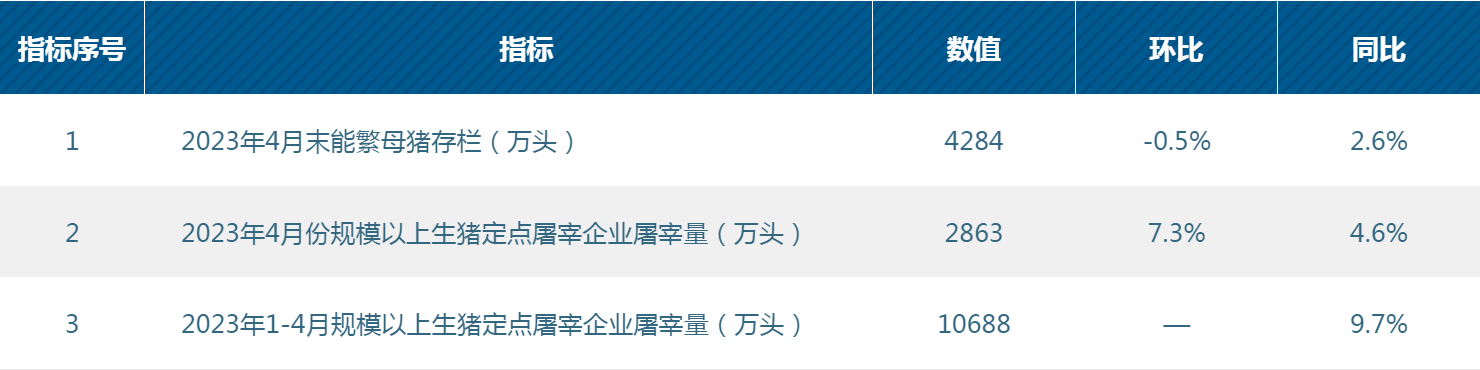 根据平台数据,生产方面,2023年4月末,国内能繁母猪存栏4284万头,环比下降0.5%,同比上涨2.6%;规模以上生猪定点屠宰企业4月屠宰量为2863万头,环比上涨7.3%,同比上涨4.6%。