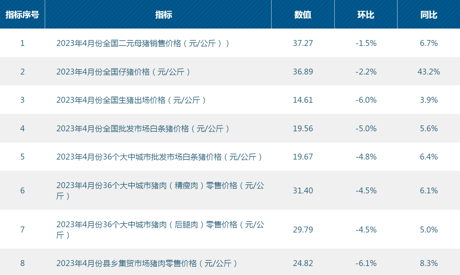 价格方面,2023年4月,全国生猪出场价格14.61元/公斤,环比下降6%,同比上涨3.9%;全国批发市场白条猪价格19.56元/公斤,环比下降5%,同比上涨5.6%。