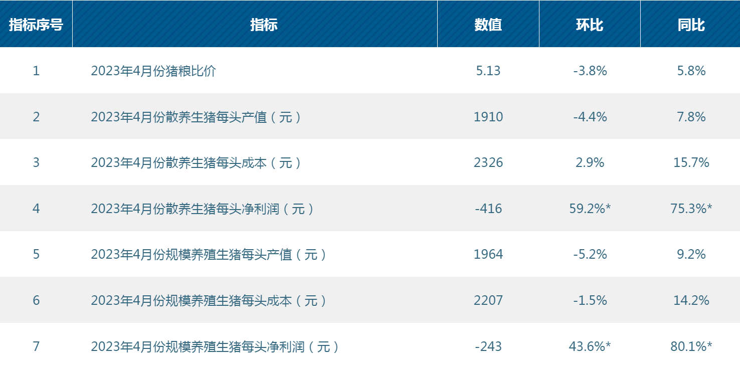 成本收益方面,2023年4月,猪粮比价为5.13,环比下降3.8%,同比上升5.8%。散养生猪每头净利润亏损416元,环比扩大59.2%;规模养殖生猪每头净利润亏损243元,环比扩大43.6%。