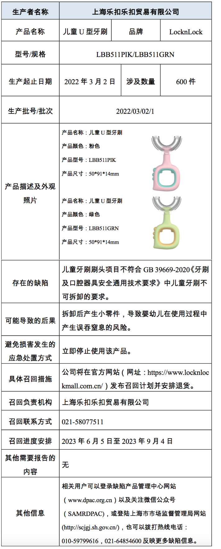 新京报讯(记者张洁)6月5日,上海市市场监管局微信公众号发布消息称,因拆卸后产生小零件,导致婴幼儿在使用过程中产生误吞窒息的风险,上海乐扣乐扣贸易有限公司自2023年6月5日至2023年9月4日,召回2022年3月2日生产的“LocknLock”儿童U型牙刷,涉及600件。
