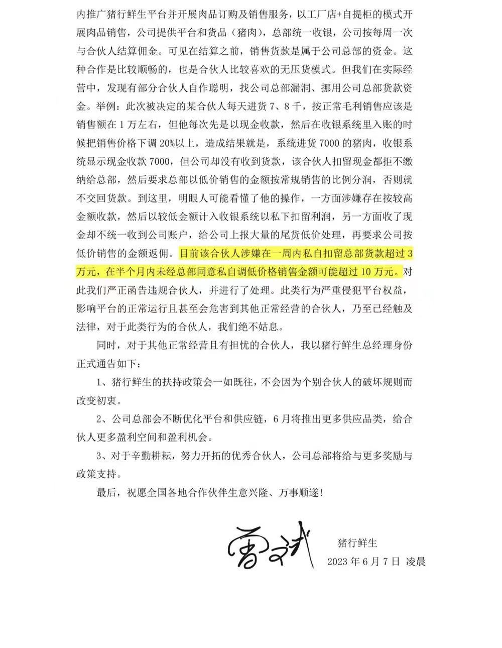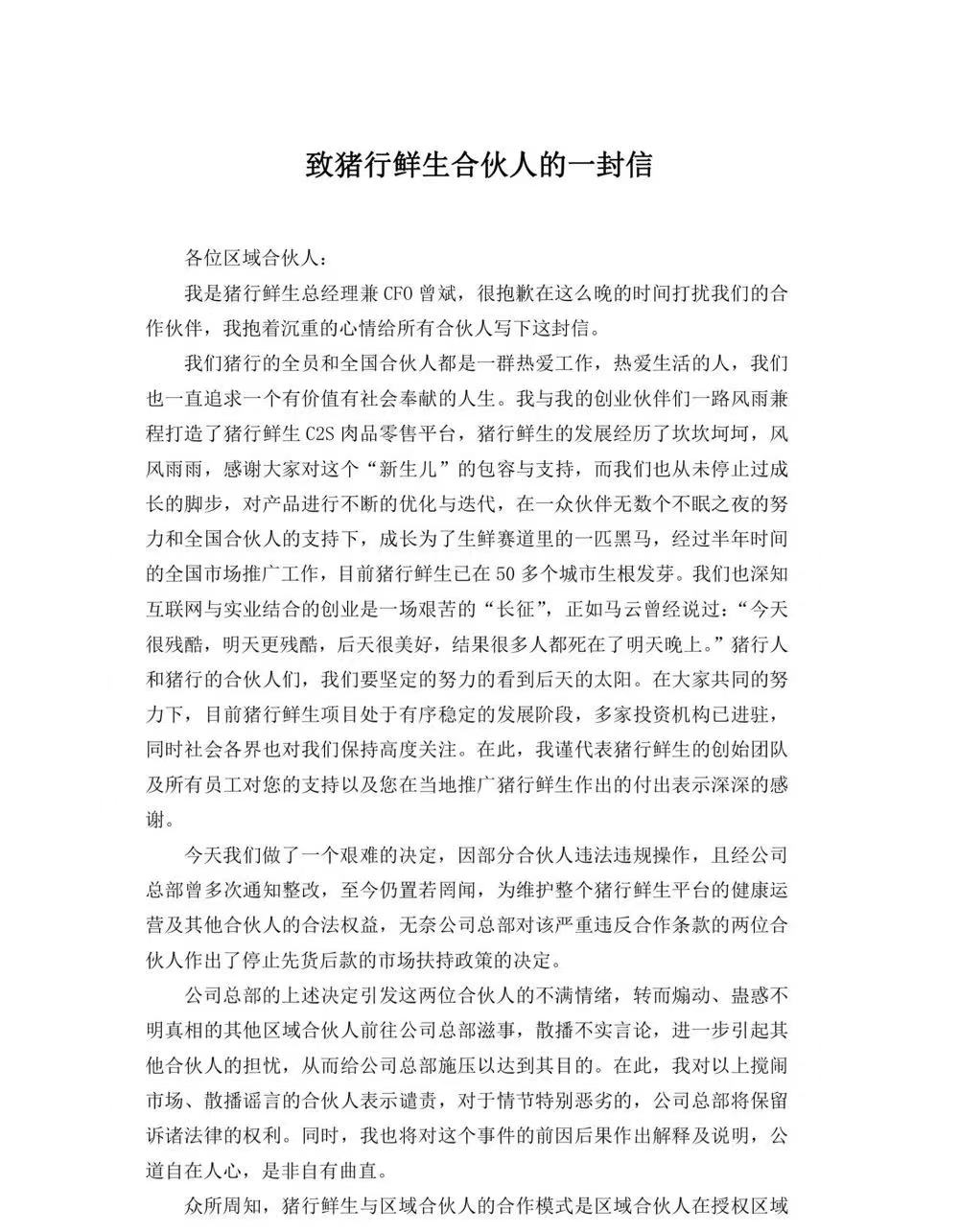 新京报讯(记者张洁)6月7日,新京报记者从猪行鲜生获悉,公司总经理兼CFO曾斌凌晨发布“致猪行鲜生合伙人的一封信”称,因部分合伙人违法违规操作,且经公司总部多次通知整改,至今置若罔闻,为维护整个猪行鲜生平台的健康运营及其他合伙人的合法权益,公司总部对该严重违反合作条款的两名合伙人作出停止先货后款的市场扶持政策的决定。