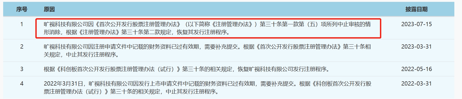 新京报贝壳财经讯7月15日傍晚,据上交所官网显示,旷视科技因《首次公开发行股票注册管理办法》(以下简称《注册管理办法》)第三十条第一款第(五)项所列中止审核的情形消除,根据《注册管理办法》第三十条第二款规定,恢复其发行注册程序。