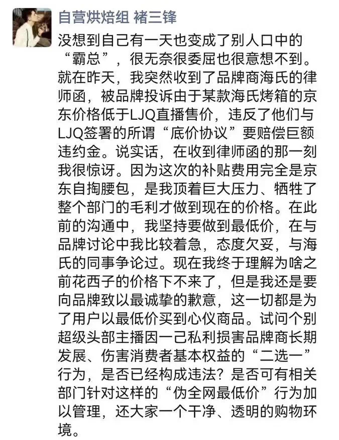 10月25日下午,京东家电家居事业部负责人在朋友圈再度回应此事称,“面对某些头部主播为了一己私利,剥夺消费者享受真低价权益的乱象,我们要抵制全网底价协议霸王条款。”