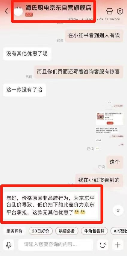 10月24日晚,海氏烤箱发布声明称,海氏品牌没有和京东采销人员所指的渠道签订任何“底价协议”,海氏品牌为确保消费者的权益,在双十一期间对该烤箱定价按各平台营销节奏,将最低销售价全网拉齐。