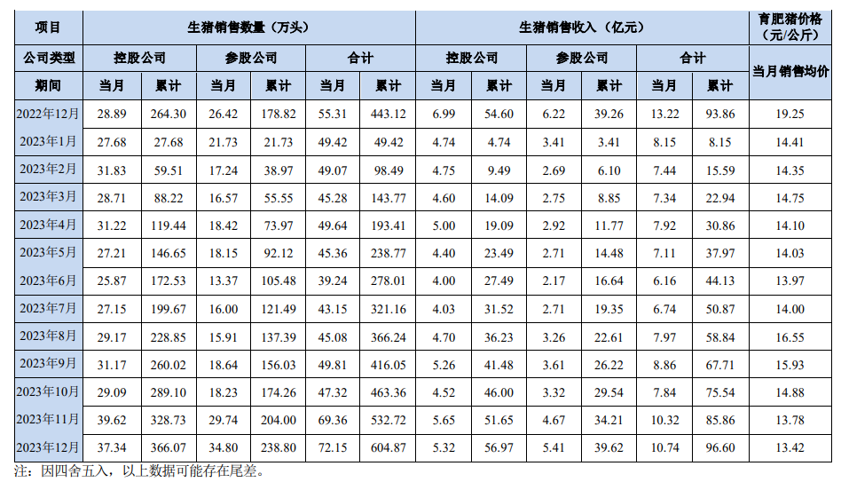 新京报贝壳财经讯(记者阎侠)1月4日,大北农发布2023年12月份生猪销售情况简报。2023年12月,大北农的控股公司生猪销售数量为37.34万头,销售收入5.32亿元,商品肥猪出栏均重117.44公斤,销售均价13.57元/公斤;同期,大北农的参股公司生猪销售数量为34.8万头,销售收入5.41亿元,商品肥猪出栏均重118.44公斤,销售均价13.28元/公斤。2023年全年,大北农的控股及参股公司的生猪销售数量累计为604.87万头,销售收入累计为96.6亿元。