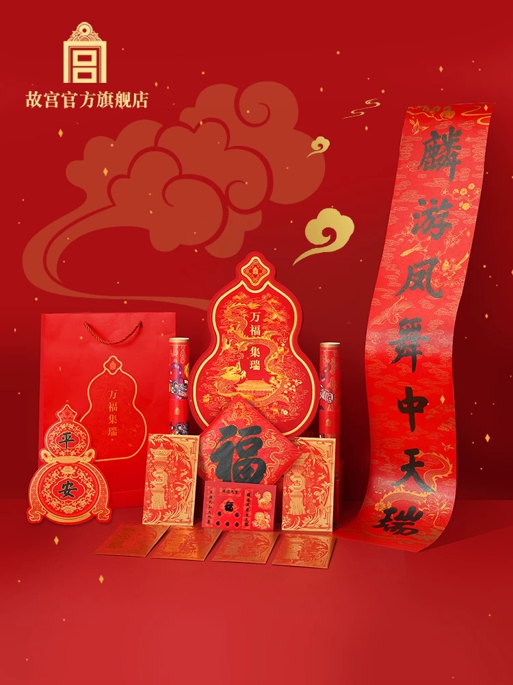 “万福集瑞·福禄贺岁”套装汲取紫禁城过大年的礼仪与习俗,为消费者带来独特的文化体验。这款产品的外观设计突破传统,选用院藏文物填漆锦纹葫芦式盒型,寓意福禄平安,为春节带来吉祥祝福。