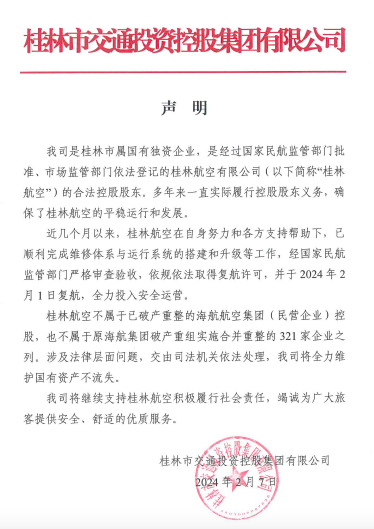 桂林市交通投资控股集团有限公司在声明中表示,公司是桂林市属国有独资企业,是经过国家民航监管部门批准、市场监管部门依法登记的桂林航空有限公司(以下简称“桂林航空”)的合法控股股东。近几个月以来,桂林航空在自身努力和各方支持帮助下,已顺利完成维修体系与运行系统的搭建和升级等工作,经国家民航监管部门严格审查验收,依规依法取得复航许可,并于2024年2月1日复航,全力投入安全运营。