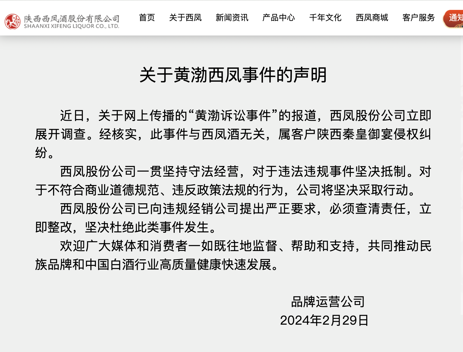 对此,西凤酒立即展开调查,并于2月29日发布声明,称此事件与西凤酒无关,是其客户陕西秦皇御宴的侵权纠纷。