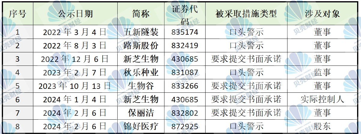 在2月6日距今最近的公示表中,北交所一共对6家存在违规情况的上市公司股东或董监高等成员,做出“口头警示”或“要求提交书面承诺”等监管措施,其中锦好医疗、保丽洁两家公司存在着“短线交易违规”情况。