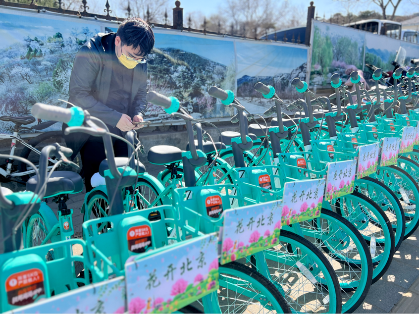 据介绍,滴滴青桔单车为响应市园林绿化局“花开北京”赏花季活动的号召,在10条精选骑行赏花线路定向投放“彩蛋车”和2000辆滴滴青桔“小灰座”最新车型,保障市民在公园景区与公共交通间的接驳。