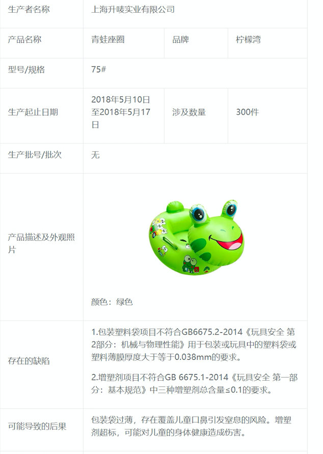 新京报讯(记者张洁)4月11日,上海市市场监督管理局官网发布消息称,上海升唛实业有限公司召回2018年5月10日至2018年5月17日生产的“柠檬湾”牌青蛙座圈,涉及数量300件。