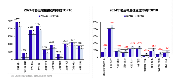 航班管家表示,与去年相比,2024年暑运部分城市航线变动较大,北上广相关城市航线增量较大,日均增量多在10班以上;呼和浩特往返呼伦贝尔航线的航班减量最多,日均往返从21班次下降至12班次;两条西宁航线“西安-西宁”“北京-西宁”、两条西双版纳航线“南京-西双版纳”“重庆-西双版纳”的航班量也存在较大幅度减量。