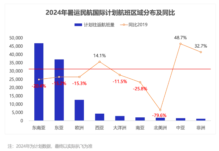 2024年暑运期间,热门通航国家日本、泰国、韩国位列前三,不过三者均未恢复至2019年同期水平,其中,韩国恢复水平优于日本与泰国;暑运排名前20的通航国家中,马来西亚、新加坡、英国、阿联酋、意大利、哈萨克斯坦、卡塔尔等七国计划航班量超过2019年同期水平。