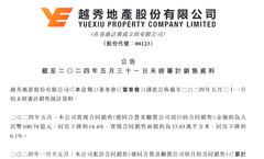 新京报讯(记者袁秀丽)7月5日,越秀地产股份有限公司(简称“越秀地产”)发布公告显示,6月,该公司实现合同销售(连同合营及联营公司项目的合同销售,下同)金额约为153.08亿元,同比上升约8.5%,实现合同销售面积约为48.63万平方米,同比上升约18.2%。