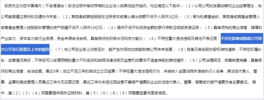 对于此次增资,西凤酒要求投资方认同公司发展战略,具有良好财务状况和支付能力,与西凤酒在业务上优势互补,且明确提出“不存在影响或阻碍公司首次公开发行股票及上市的情形”要求。