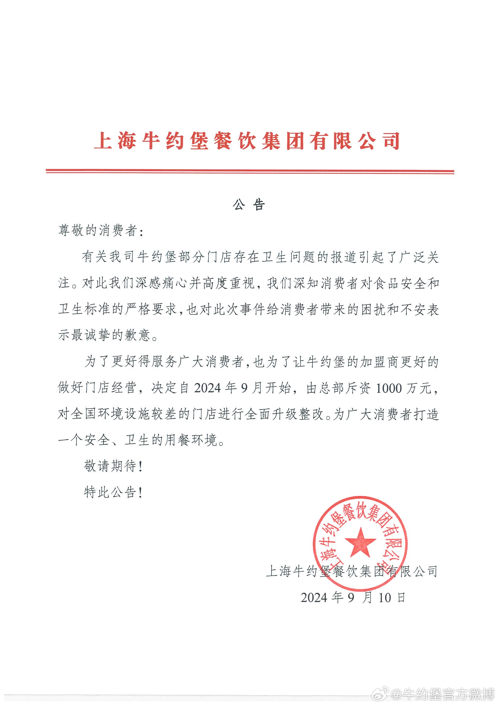 新京报讯(记者王萍)近日,连锁品牌牛约堡门店出现的食品安全问题引起关注和讨论。牛约堡连续发布微博称,涉事门店为“1.0版本”的老店,“最多时有400多家脏乱差的老店,如今只剩下60余家。”“老鼠满地跑等系夸张描述。”这样的回应引起消费者不满,“明知还有60多家脏乱差门店,但却容许其存在。”“有问题就说问题,难道还是消费者攻击你们了?”9月11日,新京报记者注意到,牛约堡微博再次发布公告,致歉的同时称自2024年9月开始,由总部斥资1000万元,对全国环境较差的门店升级整改。