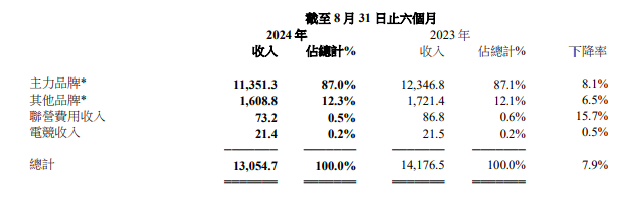 2024/25上半财年,耐克和阿迪达斯两大主力品牌收入为113.51亿元,同比去年下滑8.1%;包括彪马、匡威、亚瑟士、鬼冢虎、等在内的其他品牌收入为16.09亿元,同比下降6.5%。