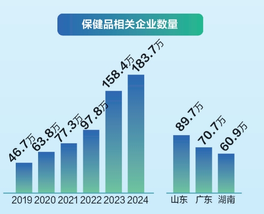 天眼查专业版数据显示,截至目前,我国现存在业、存续状态的保健品相关企业有820.8万余家。其中,2024年以来,新增注册相关企业183.7万余家。从年度企业新增数量来看,从2019年开始,近五年呈现逐年递增趋势,每年新增相关企业数量分别为46.7万余家、63.8万余家、77.3万余家、97.8万余家、158.4万余家,2023年的新增相关企业数量已经突破百万关口。
