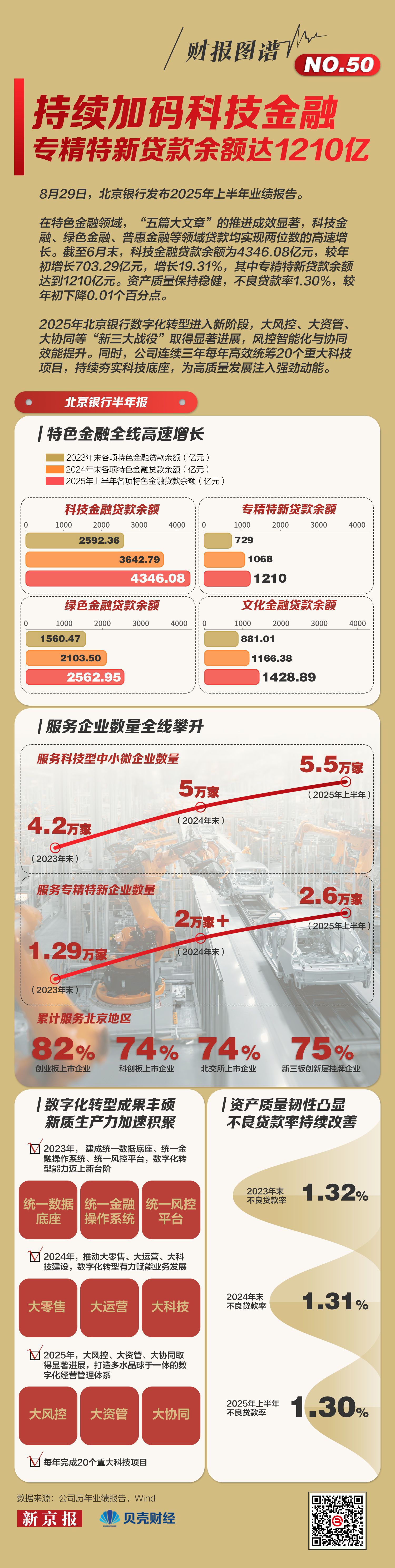 在特色金融领域,“五篇大文章”推进成效显著,科技金融、绿色金融、普惠金融等领域贷款均实现两位数高速增长。截至6月末,科技金融贷款余额为 4346.08亿元,较年初增长 703.29亿元,增长19.31%,其中专精特新贷款余额达到1210亿元。资产质量保持稳健,不良贷款率1.30%,较年初下降 0.01 个百分点。