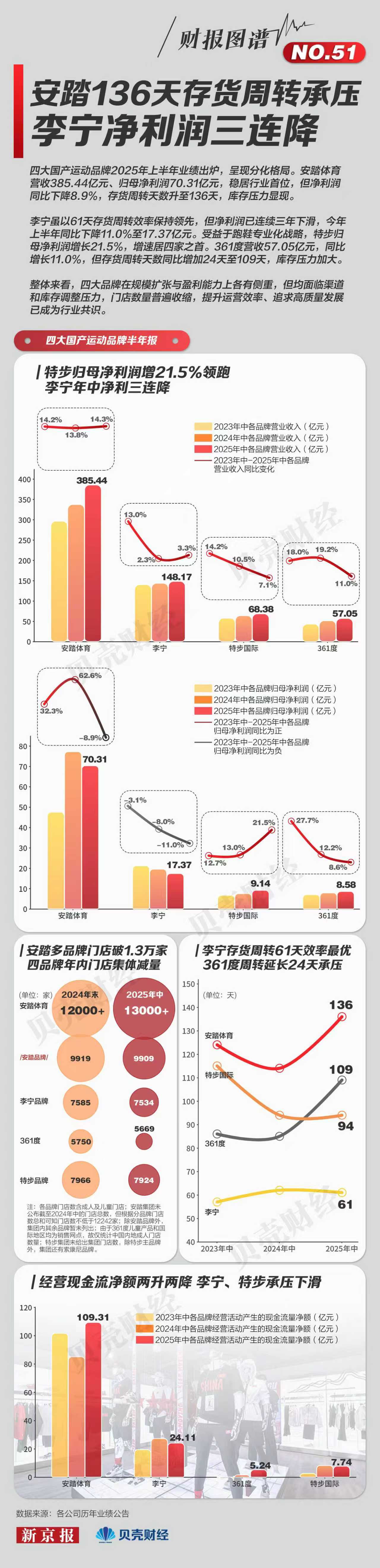 四大国产运动品牌2025年上半年业绩出炉,呈现分化格局。安踏体育营收385.44亿元、归母净利润70.31亿元,稳居行业首位,但净利润同比下降8.9%,存货周转天数升至136天,库存压力显现。