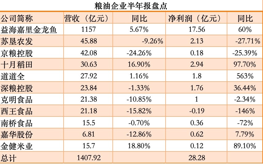 统计半年报数据发现,11家粮油企业上半年总计实现营收1407.92亿元,净利润28.28亿元。其中,4家企业实现营收与净利润双增长,分别是益海嘉里金龙鱼、十月稻田、道道全、金健米业,而出现营收净利润双降的企业有5家,包括苏垦农发、京粮控股、克明食品、西王食品、南桥食品。