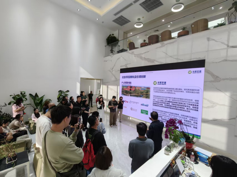 在走访过程中,华辉安健高级研发技术总监陈建和带着媒体调研团参观了公司的细胞间、早研开放实验室等区域。
