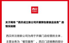 在“预制菜风波”后,西贝押注预包装食品引发关注。10月13日,记者自西贝餐饮集团获悉,“该注册行为不代表西贝将开展涉及预制菜的新业务” “西贝所注册新公司为用于开展门店经营的主体,主营业务为餐饮服务。西贝门店销售的部分饮料(如西贝自有品牌瓶装沙棘汁等)、西贝杂粮月饼属于预包装食品”。