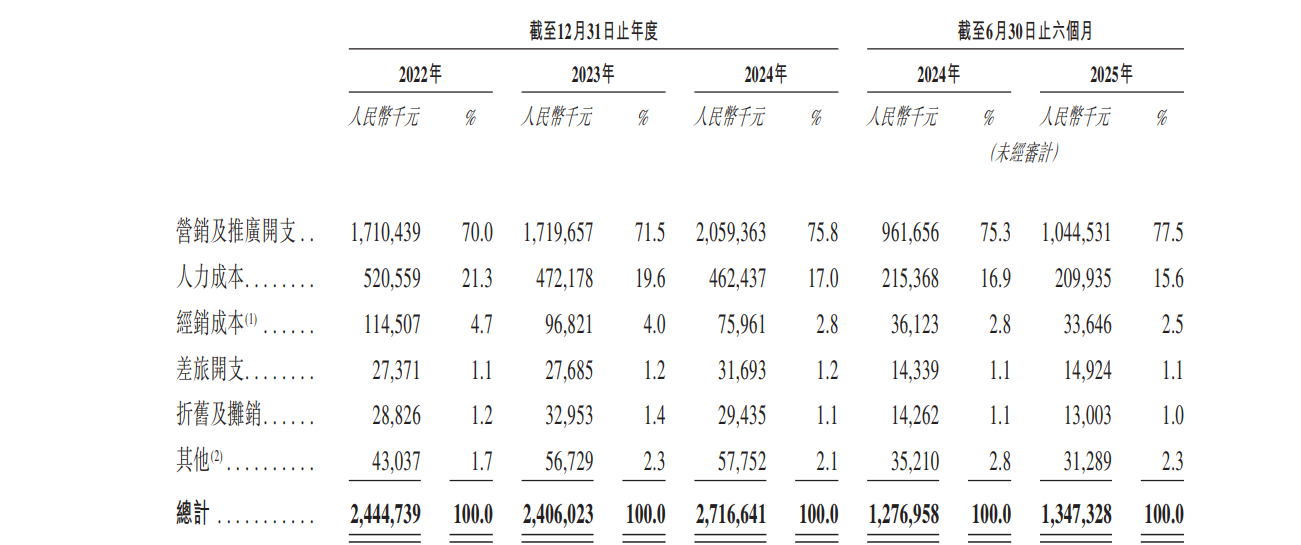 招股书显示,自然堂的销售及营销成本包括营销及推广开支、人力成本、经销成本、差旅开支、折旧及摊销等。2022年-2024年,该公司销售及营销成本分别约24.45亿元、24.06亿元和27.17亿元,约占其全年收入的57%、54.2%以及59%。也就是说,该公司有过半收入用于销售及营销。