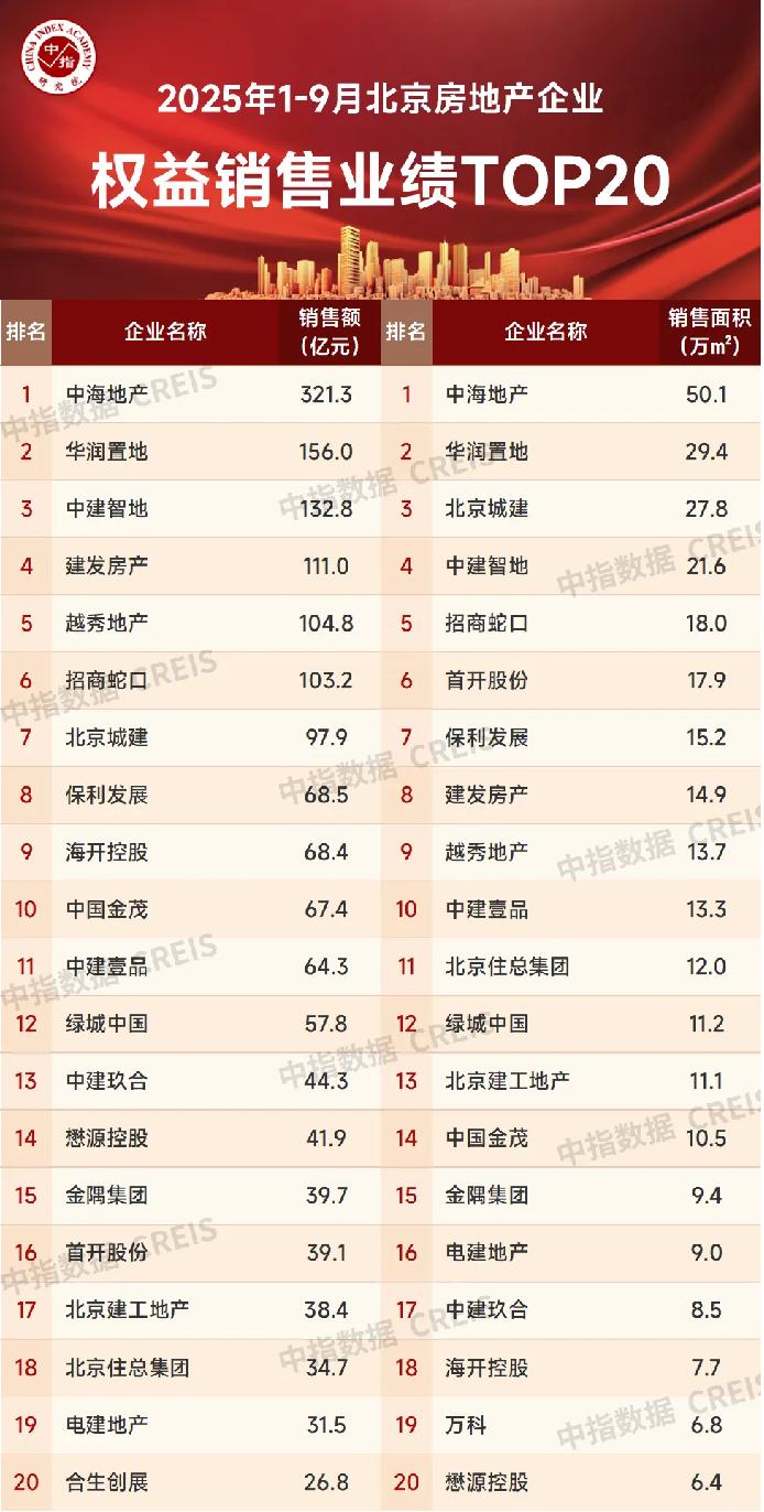 今年前三季度,北京楼市在政策优化与市场调整的双重作用下,上演了一场关于产品力、资金实力的全面较量。据中指研究院发布的全口径房企销售金额榜单,1-9月份,8家房企销售额超过百亿,中海地产、华润置地、越秀地产位列前三。