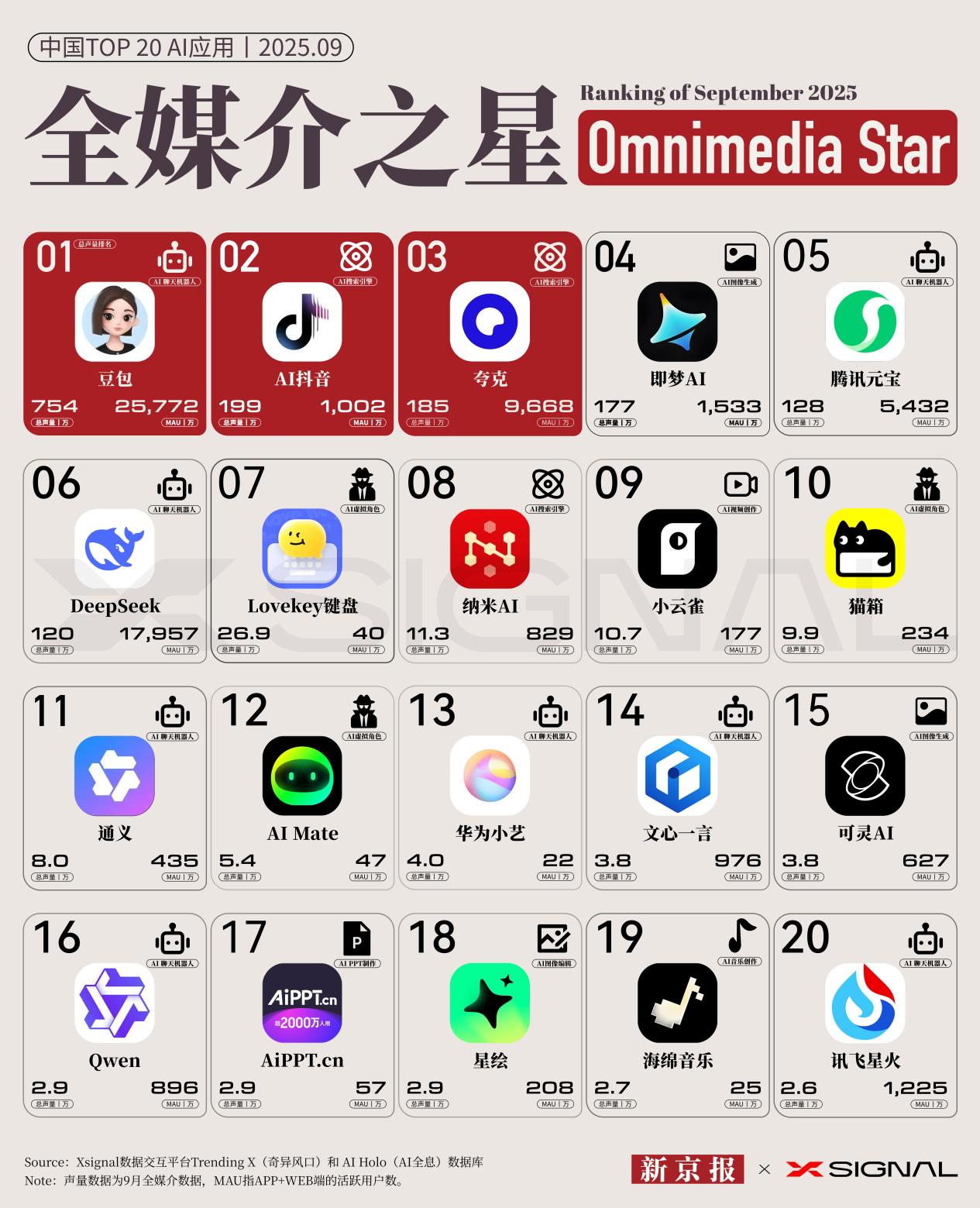 10月18日,新京报AI研究院与Xsignal联合发布2025年9月“全媒介之星”中国TOP 20 AI应用榜单。本榜单根据AI应用的全媒介声量梳理出了2025年9月排名前20的国内AI应用,并同时统计了应用的MAU(月活跃用户)数据。从这两项数据的对比,可以窥见国内AI应用发展趋势。
