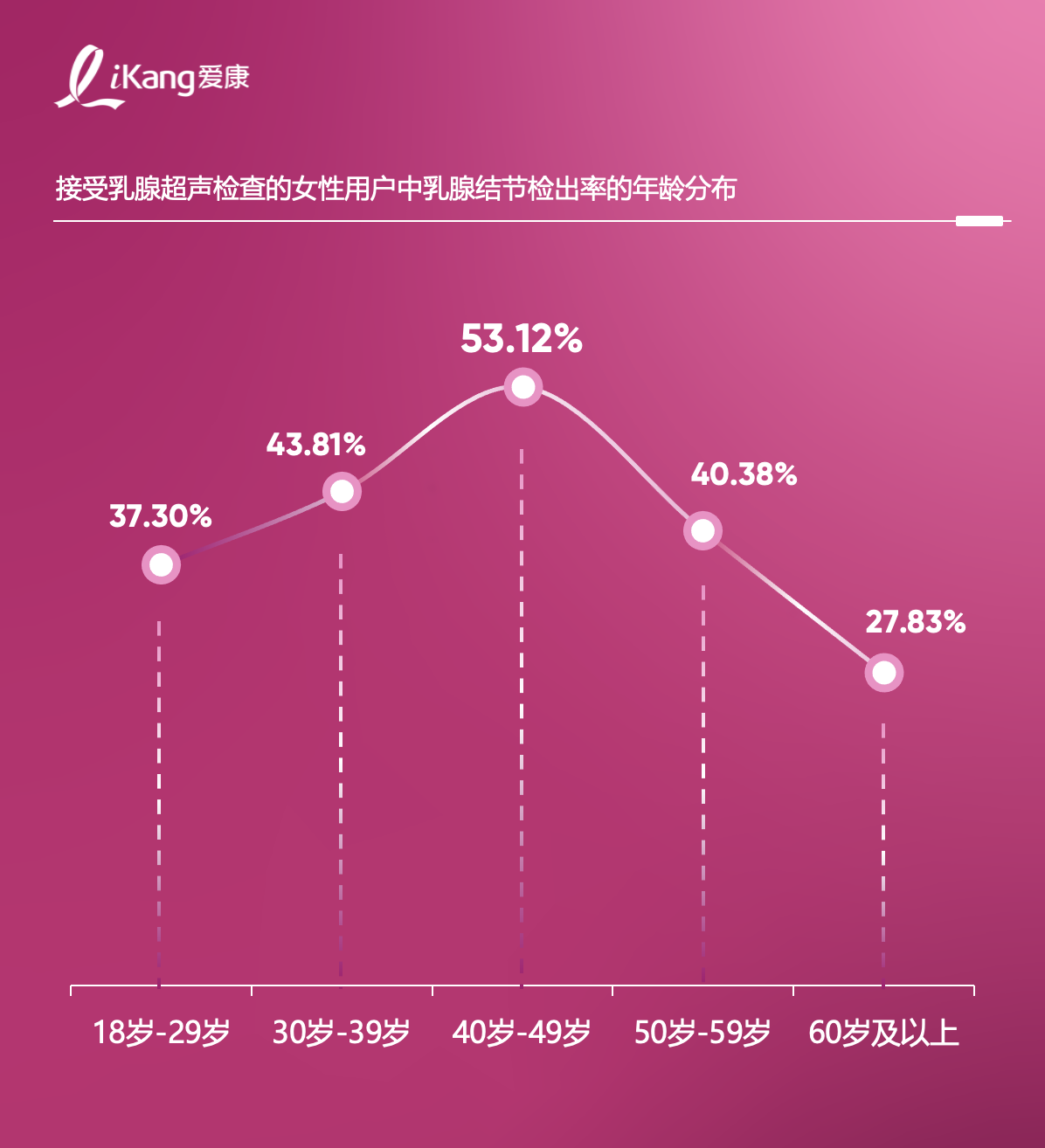 随着年龄的增长,乳腺结节的检出率呈现先升后降趋势。其中,18-29岁、30-39岁女性检出率分别为37.30%、43.81%,“上有老下有小”的40-49岁女性,成为检出率最高的年龄段,达53.12%,可能与这一年龄阶段女性体内激素水平的显著波动有关。在50-59岁、60岁及以上人群中,乳腺结节检出率开始逐渐下降,分别为40.38%、27.83%。