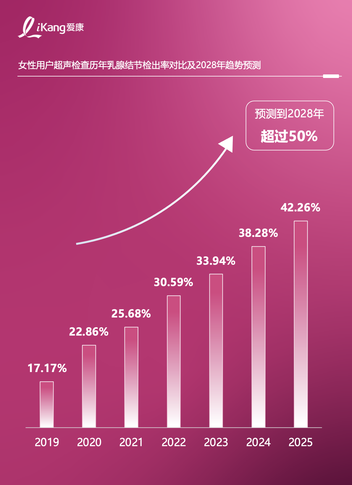 《粉红报告》预测,在不考虑人口年龄结构、国家卫生政策及其他影响因素变动的情况下,到2028年,乳腺结节检出率预计将超过50%。
