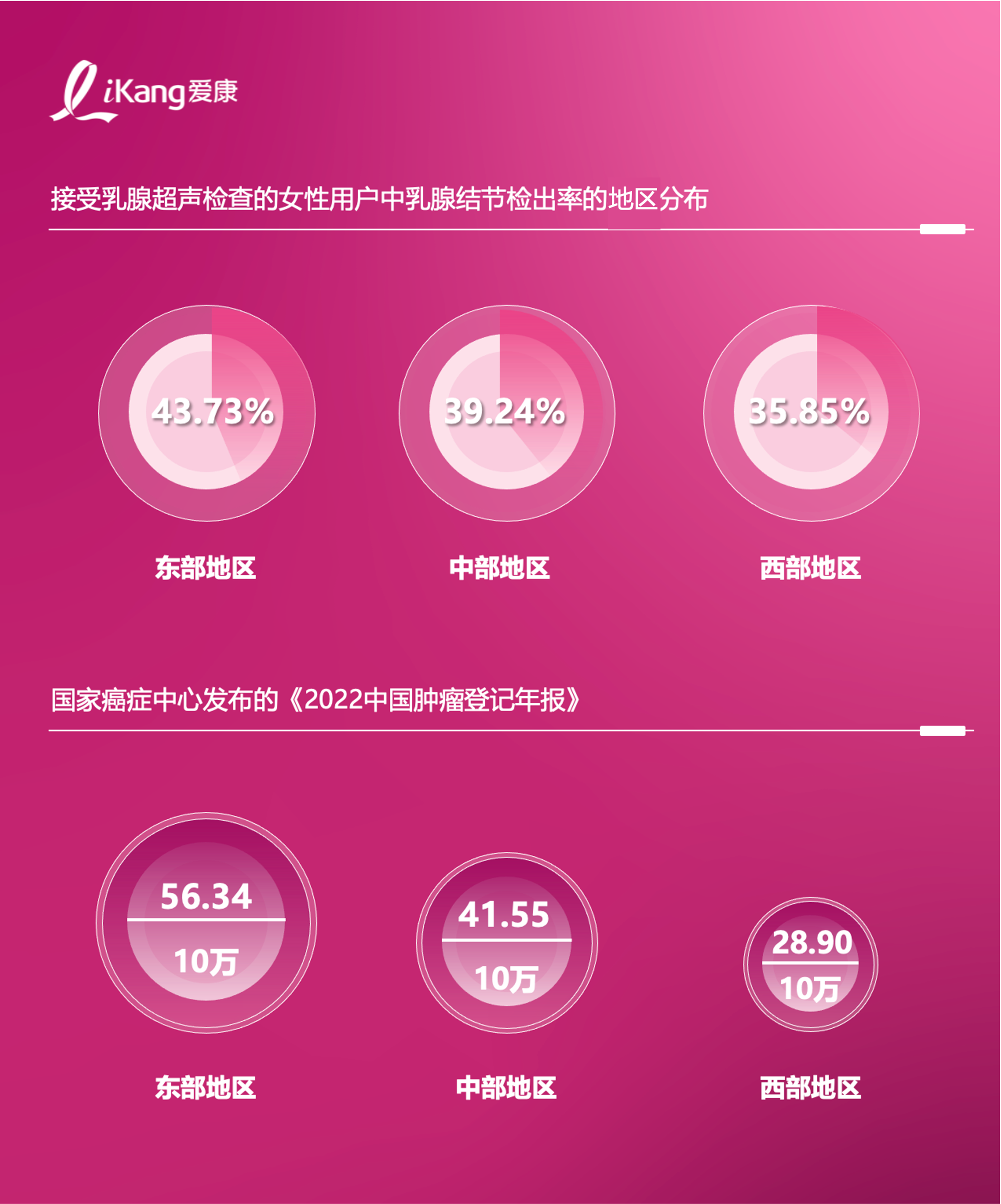 从地域分布来看,经济实力和竞争压力一起“遥遥领先”的东部地区乳腺结节检出率最高,达43.73%,中部地区为39.24%,西部地区最低(35.85%),这一趋势与国家癌症中心统计的乳腺癌发病率在地理分区分布上呈正相关。