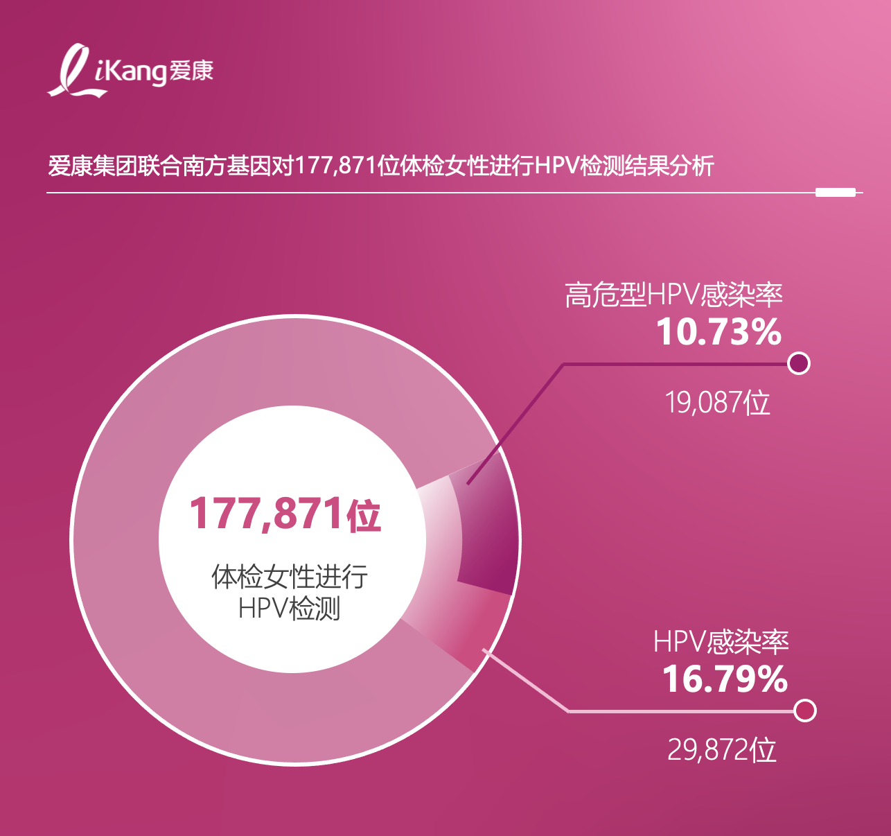 除乳腺癌外,宫颈癌和卵巢癌也是暗藏在女性身边的“沉默杀手”。宫颈癌更是中国女性最常见的妇科恶性肿瘤之一,位居中国女性癌症新发病例TOP5。高危型人乳头瘤病毒(HPV)持续感染是其主要病因。《粉红报告》显示,2023年3月1日到2025年8月15日,爱康集团联合南方基因对177871位体检女性进行了HPV检测,其中29872人(16.79%)感染HPV,10.73%为高危型HPV感染。
