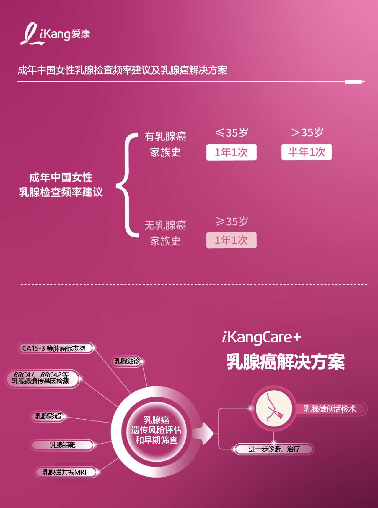 定期进行健康体检,是远离乳腺癌这一“粉红杀手”的重要措施。爱康建议,中国女性从35岁开始,乳腺检查频率建议一年一次;超过35岁且有乳腺癌家族史的女性,建议缩短到半年一次;有BRCA基因突变的女性,则需要从18岁开始定期筛查。除触诊外,可结合乳腺超声、乳腺钼靶、乳腺磁共振、肿瘤标志物等针对性检查。