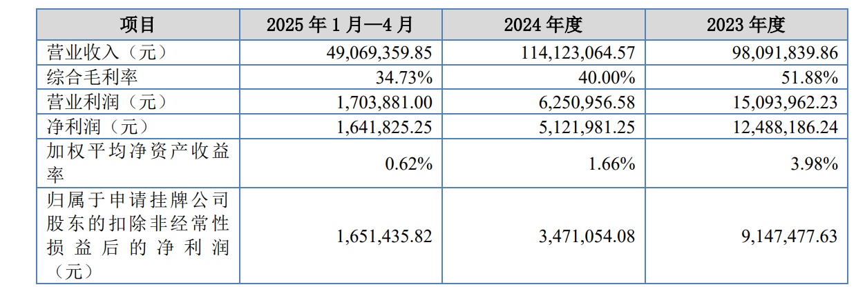 从业绩表现来看,2023年、2024年以及2025年1月-4月,安华生物分别实现营业收入9809.18万元、1.14亿元和4906.94万元,该公司指出,2024年较2023年实现16.34%的增长,主要得益于公司功能性护肤品和医疗终端产品业务的发展。与营业收入相比,安华生物的净利润较为波动,各报告期内净利润分别约1248.82万元、512.2万元和164.18万元,其中,受成本、研发费用均有所上升等因素影响,该公司2024年的净利润同比下滑了58.99%。