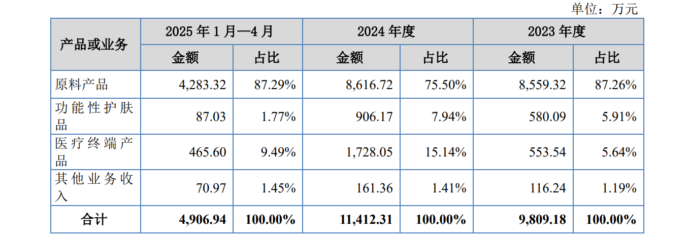 按业务划分,安华生物的收入主要来自原料产品、功能性护肤品、医疗终端产品及其他业务。