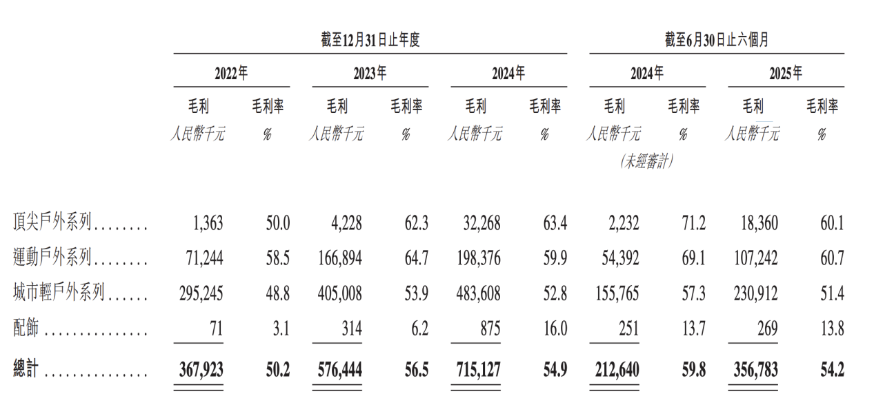根据招股书,自2022年推出千元以上的顶尖户外系列产品以来,截至2025年6月30日,坦博尔产品体系共包含687个sku,并主要划分为三大系列,即顶尖户外系列、运动户外系列与城市轻户外系列。其中,顶尖户外系列主要产品建议零售价为999元至3299元,运动户外系列主要产品建议零售价为599元至2999元,城市户外系列主要产品建议零售价为699元至1799元。