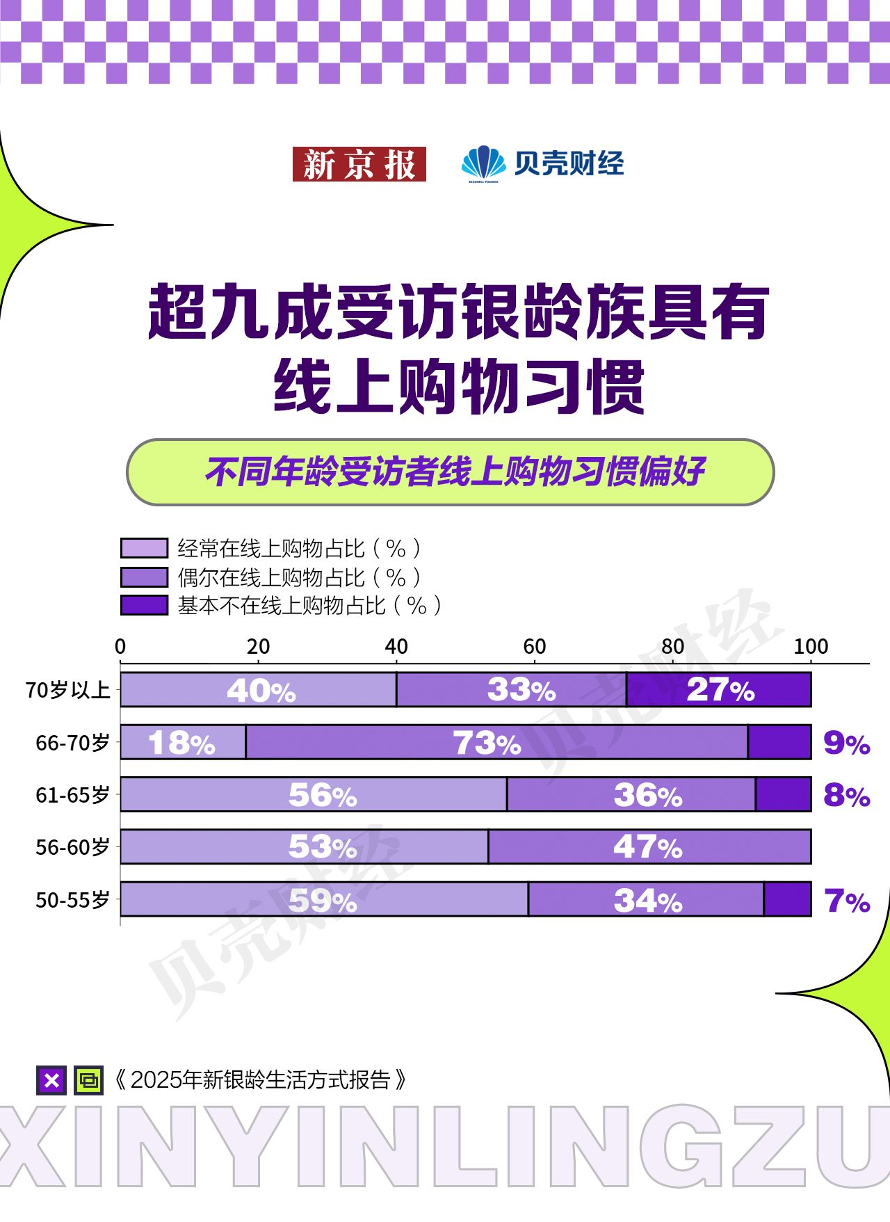 新京报贝壳财经调研显示,超过九成的受访银龄族具有线上购物习惯,其中51.2%表示“经常购买”,仅有不足10%的老年人几乎不进行线上消费。即便是70岁以上的群体,也有40%的人习惯在线下单。
