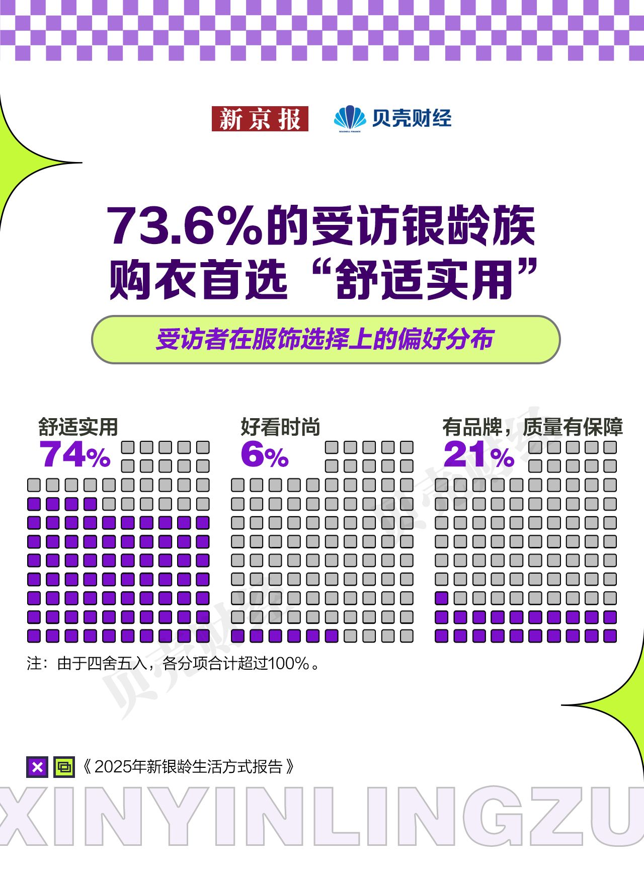 在服饰消费上,银龄族“理性悦己”同样清晰。调研显示,73.6%的受访者将“舒适实用”放在首位,20.8%选择“质量有保证”,仅有5.6%把“好看时尚”放在第一位。