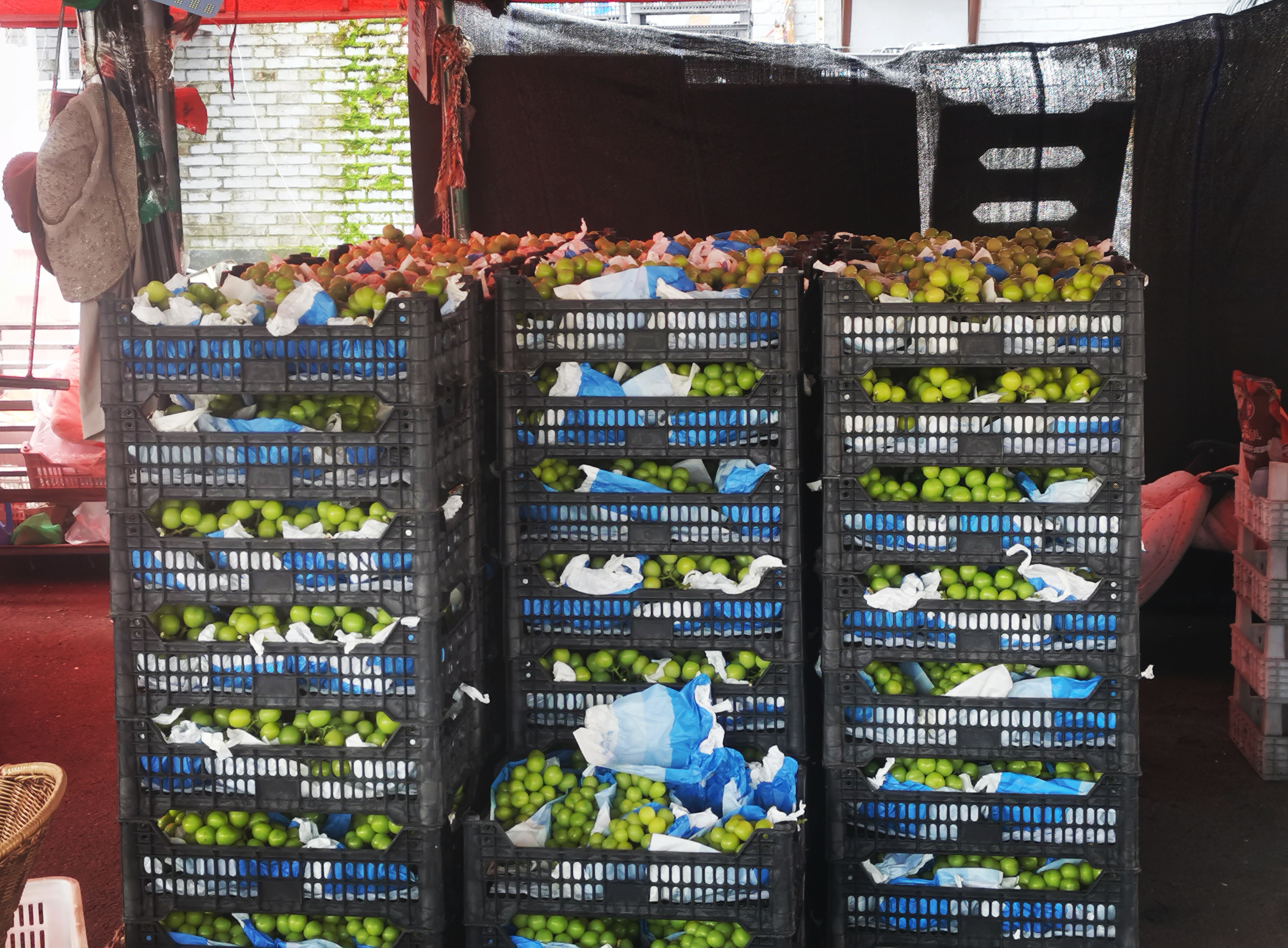 批发商赵有仁摊位成筐摆放的阳光玫瑰。