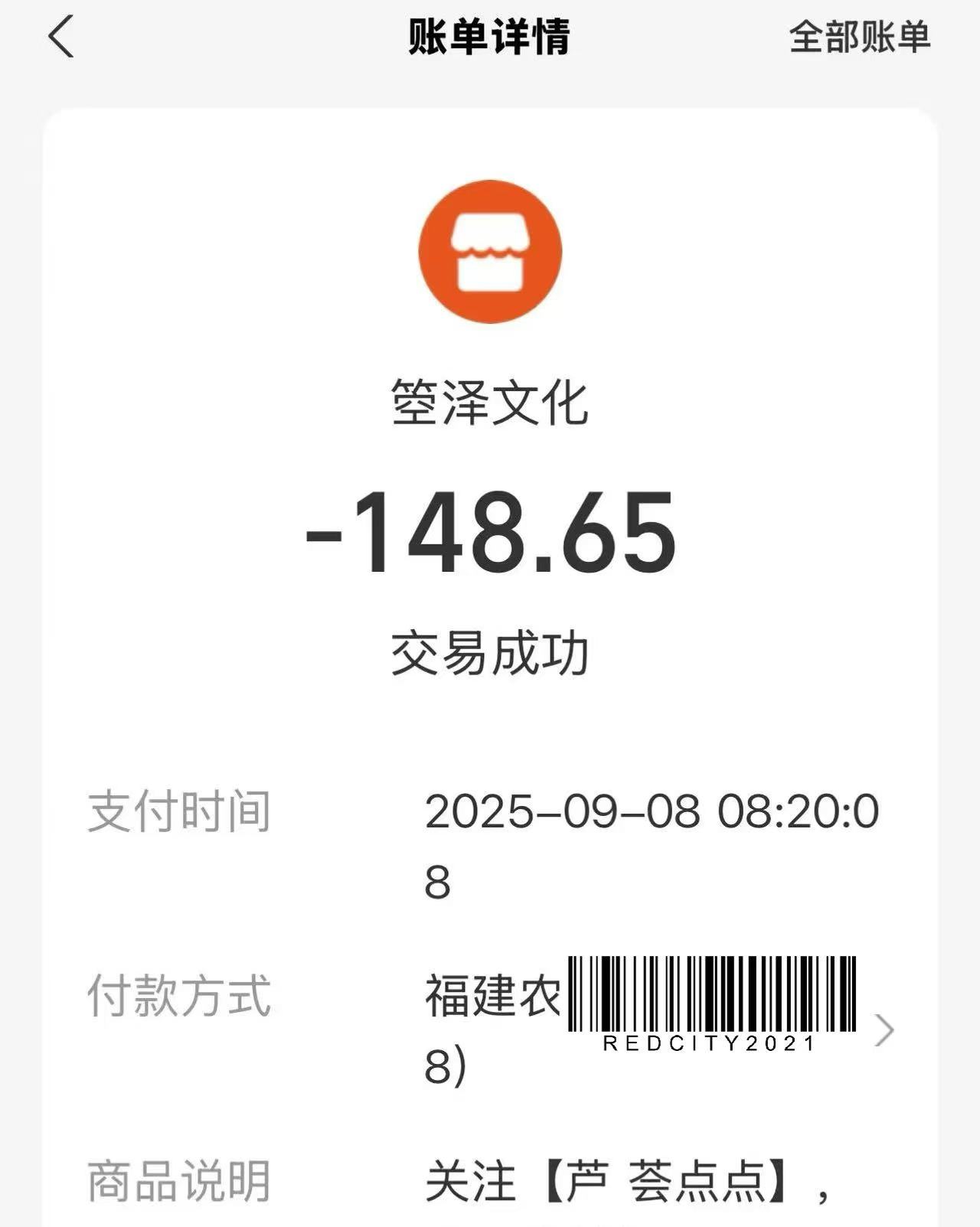 陆女士仔细检查了搜索APP的各个界面,均未找到相关付款信息,最终是在支付平台账单中发现收款方为“箜泽文化”,商品说明显示为“关注芦荟点点”。