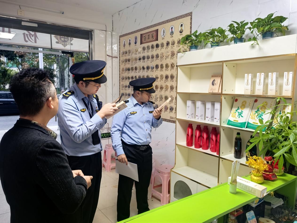 10月27日傍晚,属地市场监管所执法人员对“杨氏沙园非遗传承馆”负责人进行询问。新京报贝壳财经记者俞金旻 摄