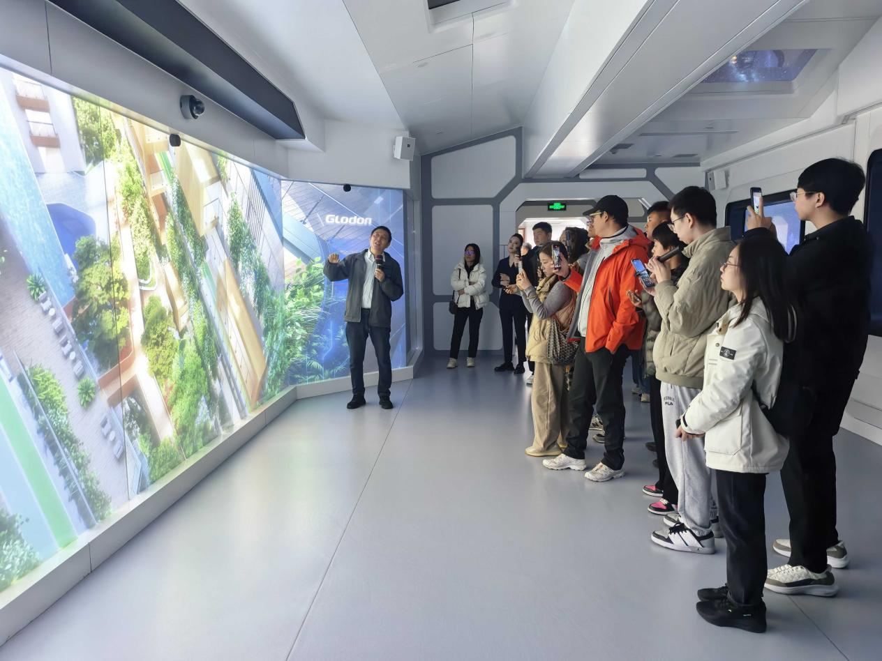 在数字建筑体验馆内,广联达数字营销部总经理吴林带领媒体调研团参观了广联达数字建筑产品研发基地展示的数字设计、智能建造、CIM等方面的创新实践,以及在北京市大兴国际机场、芬兰赫尔辛基图书馆、福州滨海新区等典型案例建设中取得的成效。