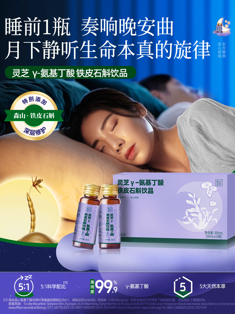 森山食养的一款灵芝γ-氨基丁酸铁皮石斛饮品在介绍中多次表示与睡眠相关。根据详情页面,“舒压助眠,酣睡整晚,睡前30分饮&晚安更轻松。双重因子,强力助眠。5:1科学配比,打破入眠困境,降低睡眠潜伏期,延长睡眠时间。”
