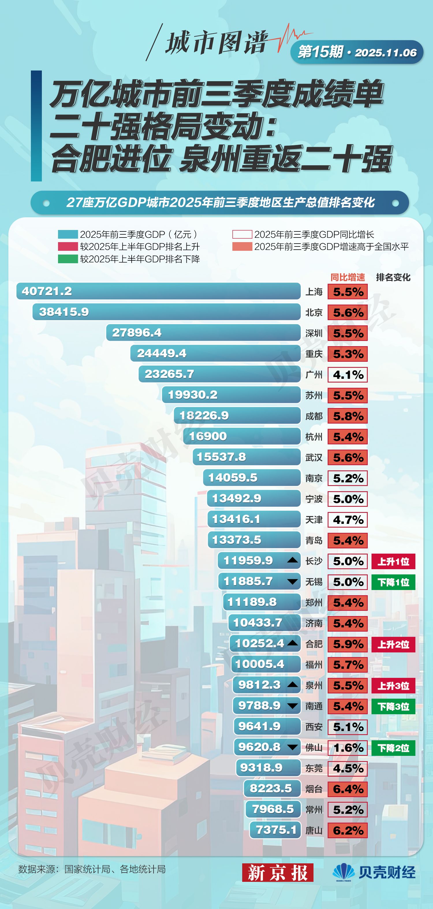 年内,万亿城市“二十强”榜单变动不断:泉州连续两个季度排名上升,超过南通,重新回归前二十行列;南通上半年强势上涨,排名较去年年末提升5位,三季度增速有所放缓,跌出二十强;合肥继续保持高速增长,上升2位至第18位;佛山则在二季度跌出二十强后,继续下滑2位,增速为1.6%。