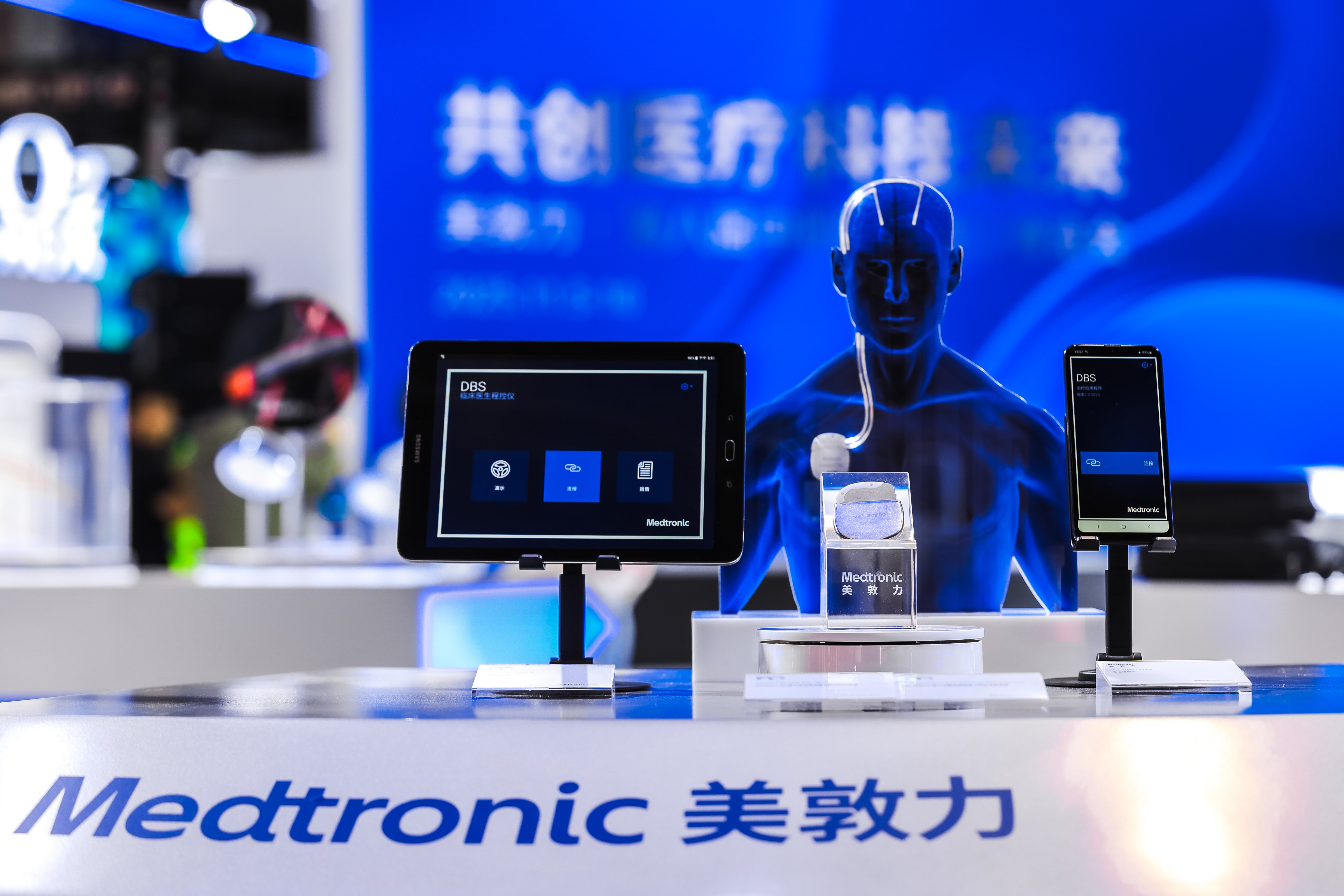 美敦力展台展出了集成人工智能和脑机接口技术的可充电、可感知闭环脑起搏器Percept RC。工作人员介绍,该款起搏器实现了“读脑—释义—反馈—疗愈”的完整闭环治疗,医生在患者胸部皮下植入刺激器,通过植入大脑中的电极,发射电脉冲刺激脑深部的特定核团,进而达到改善患者症状和生活质量的目的。该脑起搏器已获批用于治疗帕金森病、特发性震颤、肌张力障碍和药物难治性癫痫。相较于传统脑起搏器的单向治疗,Percept RC让治疗更贴合患者的病情变化和需求,实现个体化精准治疗。