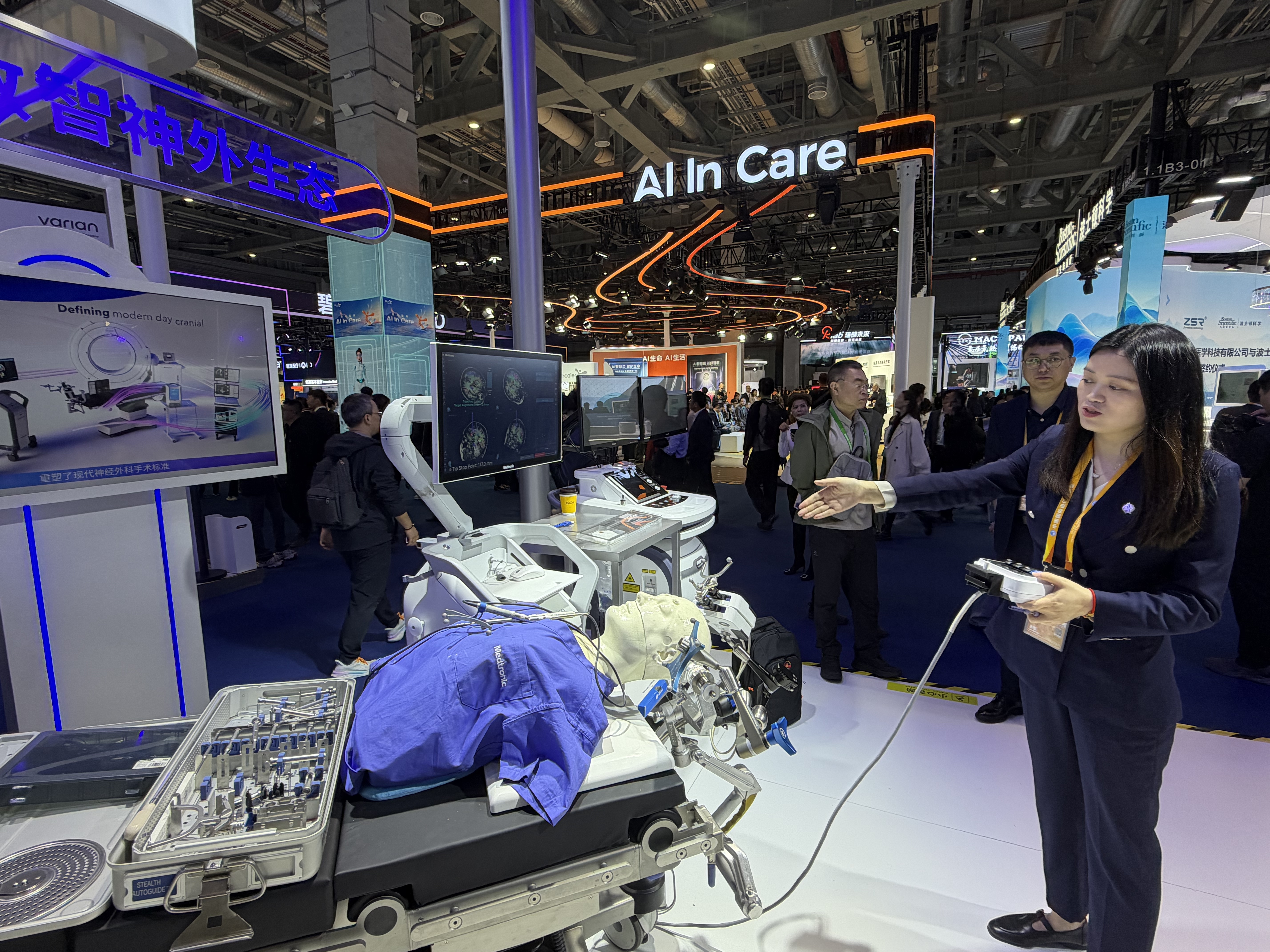 工作人员展示美敦力AiBLE数智神外生态产品的操作。图/新京报记者 王卡拉 摄
