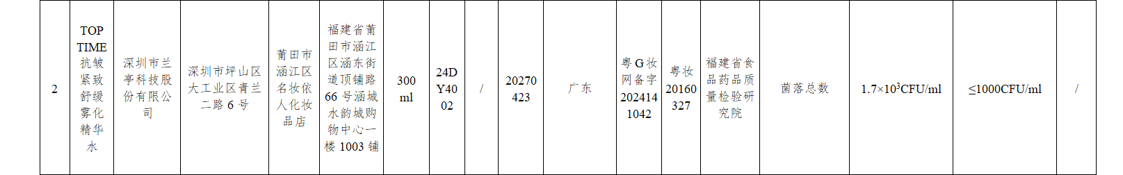 其中,经福建省食品药品质量检验研究院检验,1批次规格为300ml的“TOP TIME抗皱紧致舒缓雾化精华水”被检出菌落总数不符合规定,检验结果为1.7×10³CFU/ml,规定要求为≤1000CFU/ml。
